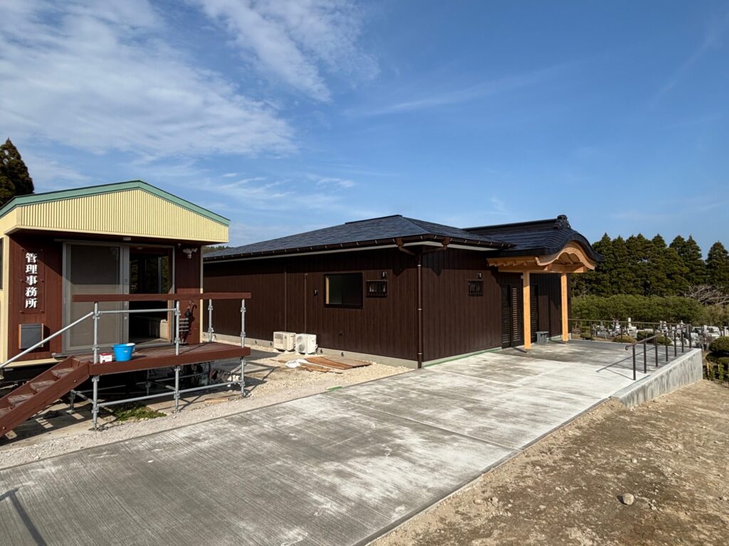 開園45年の春を迎え、新・常照殿の建設を着工しました。完成は2026年春を予定しております。40名様収容の法要スペースと更衣室、休憩場所等を設け、通夜葬儀や集団参拝にも対応いたします。それまでの間、ご法要は写真の管理事務所棟(写真)内法要室において承ります(15名様まで)。なお、更衣室のご用意がございませんので、ご法要にはご参列時の服装でお越しください。新・常照殿の完成までご不便をおかけします。